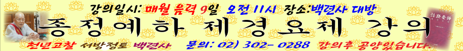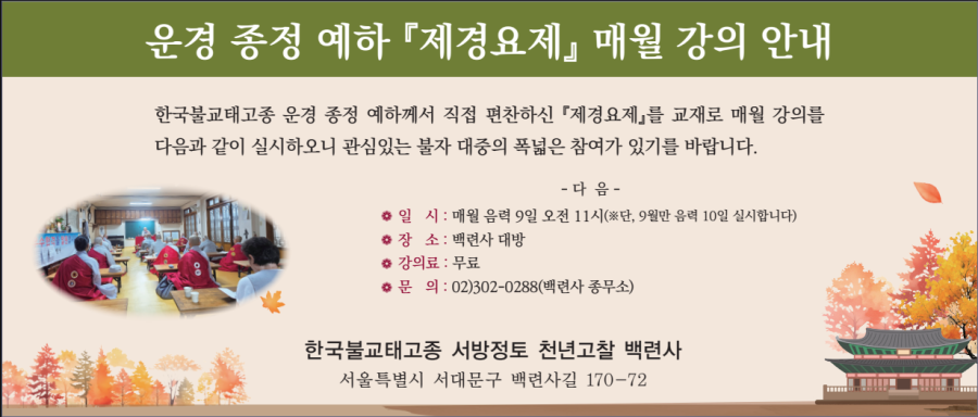 태고종 종정 예하 제경요제 강의 페이지 정보 작성자 최고관리자 댓글 0건 조회 122회 작성일 25-10-17 11:28 본문 매월 음력9일(음력 9월은 10일)에 백련사 대방에서 11시에 종정 예하 직강으로 제경용제 강의가 있습니다. 많은 참여 바랍니다. 목록 다음글<10월 17일 백련사 산사문화축제 노래자랑 참가분들을 모십니다> 25.10.01 댓글 0 댓글목록 등록된 댓글이 없습니다.